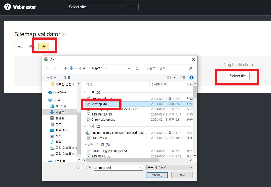 16) 다운로드 받은 파일을 file 선택후 select file 선택 sitemap.xml 선택후 올리시면 완료입니다