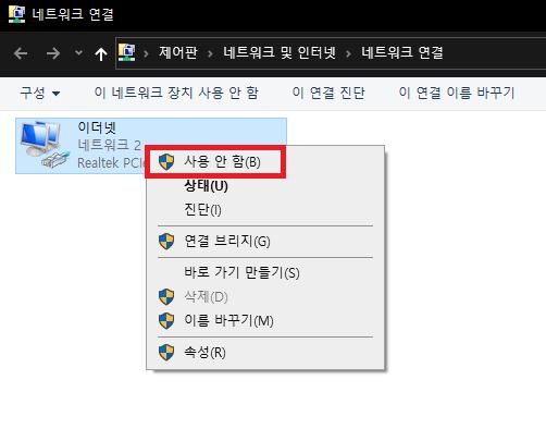2)이더넷 우클릭 사용안함(B) 클릭후 다시 사용(B)로 클릭해줍니다
