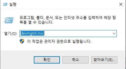 devmgmt.msc 를 입력하여 장치관리자를 실행합니다
