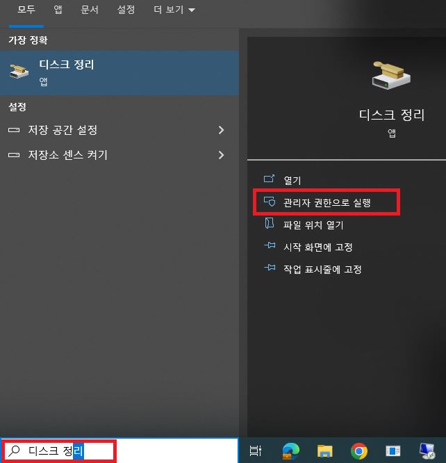 1) 검색에 "디스크 정리" 검색 후 상단클릭 관리자 권한으로 실행 클릭