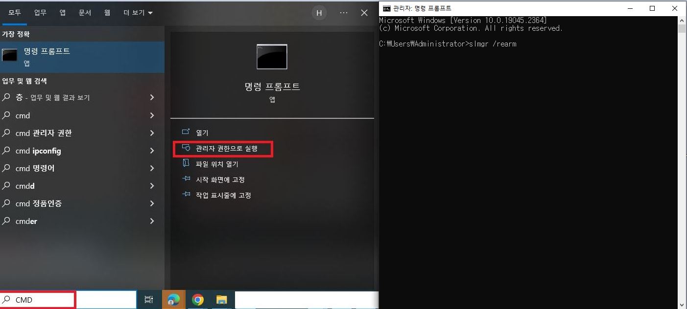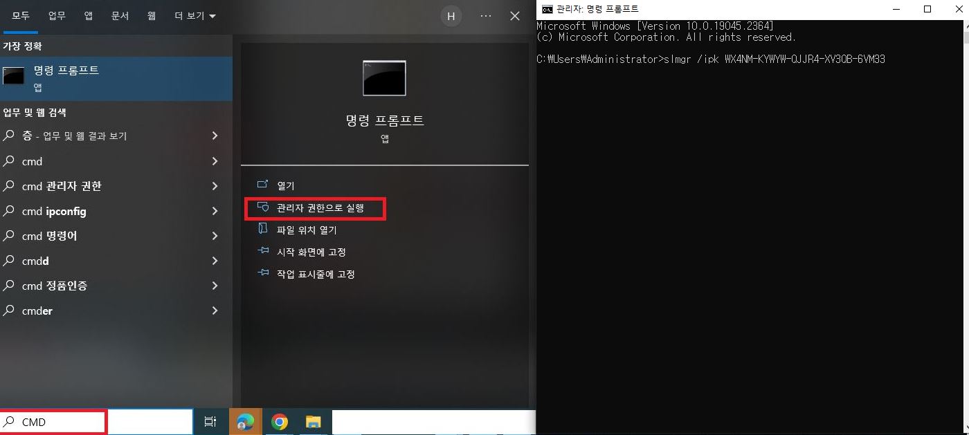 (명령 프롬프트 -> 관리자 권한으로 실행 - 위 CD키를 확인하시고 맞는 CD키를 입력 후 엔터!)