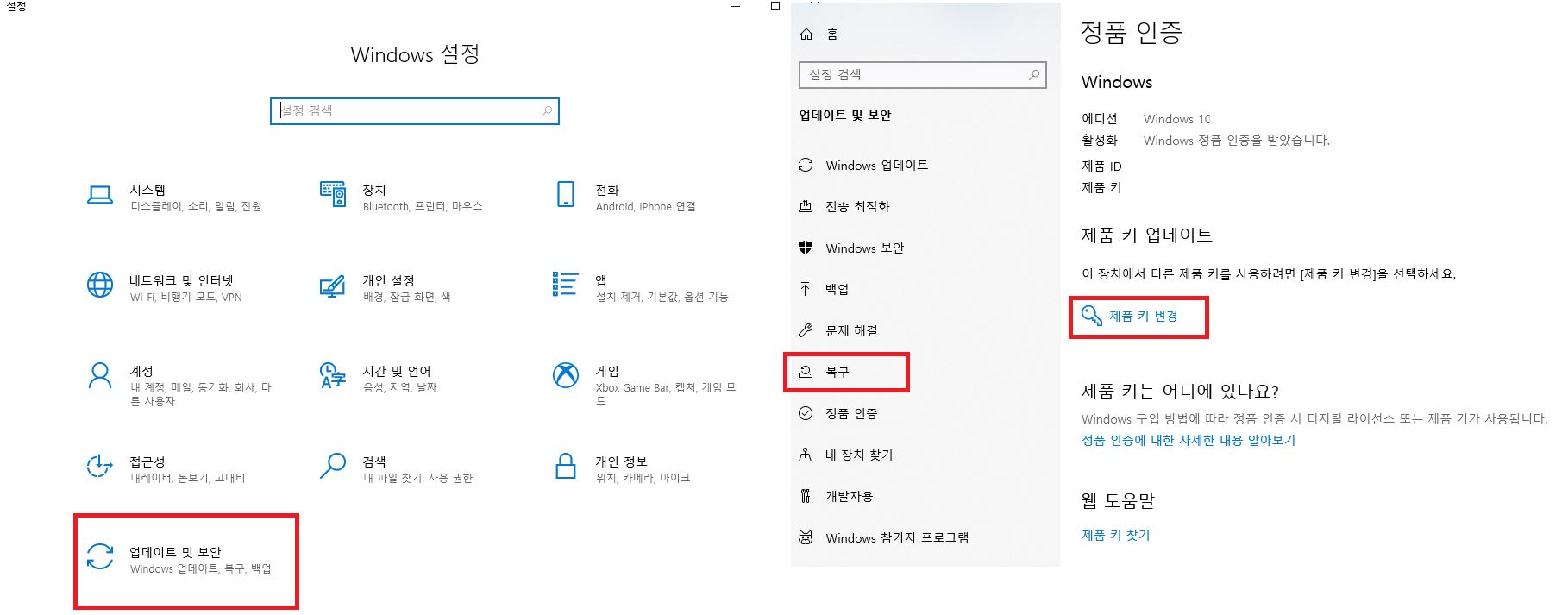 단축키: win + i ->업데이트 및 보안 -> 정품인증