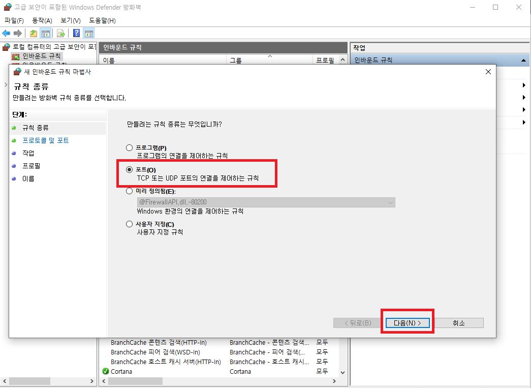 5.새 인바운드 규칙 마법사 실행됩니다 " 만들려는 규칙 종류 " 포트(O)를 클릭하고 "다음(N)"을 클릭합니다