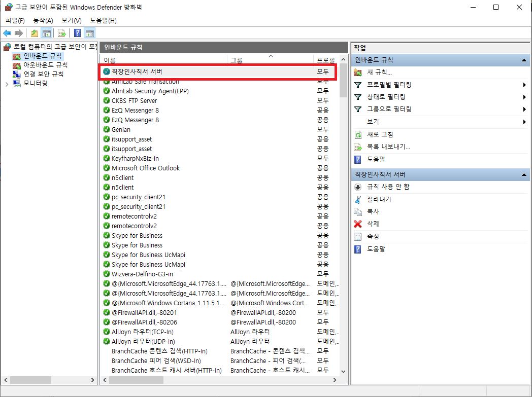 10. 새 인바운드 규칙 마법사를통해 새로운 규칙이 추가된 것을 확인할 수 있습니다