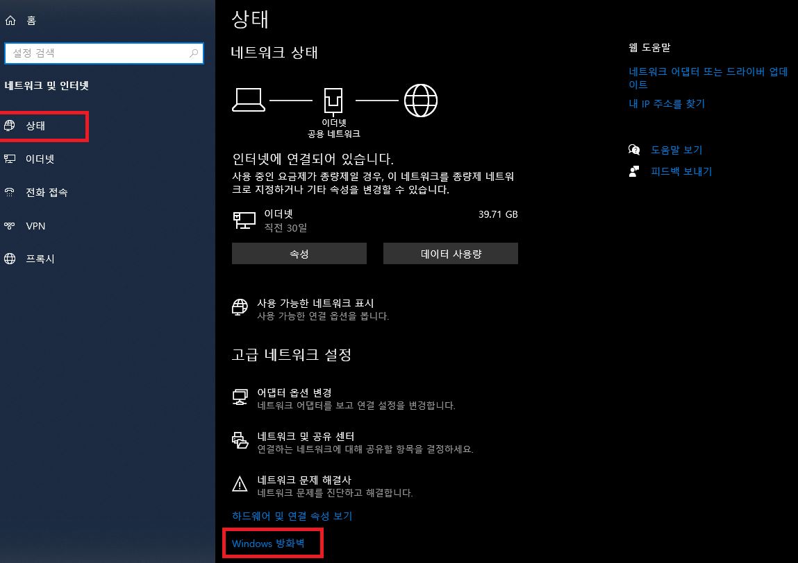2.설정목록에서 "상태" 클릭 아래 "windows 방화벽"을 클릭합니다