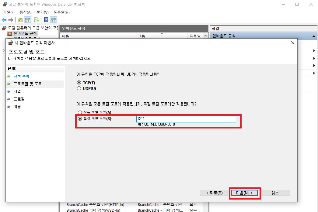6. TCP(T) , UDP(U) 선택후 "특정 로컬 포트(S)"에 포트 번호를 적어줍니다