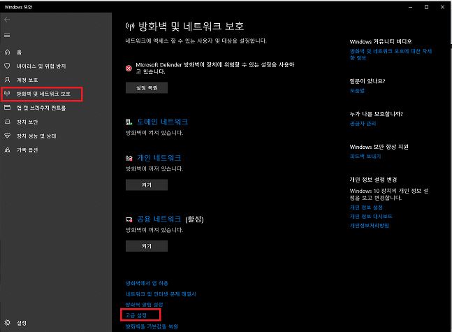 3.windows 보안 목록에서 "방화벽 및 네트워크 보호" 클릭 내용에서 "고급설정" 클릭합니다