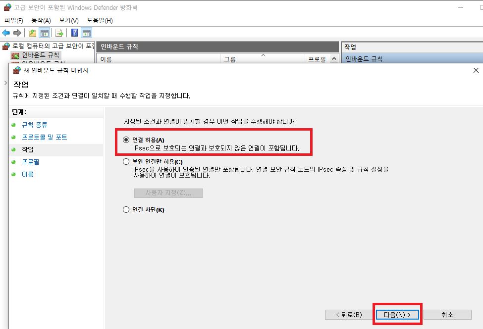 7. "연결 허용(A)" 선택후 "다음(N)" 클릭합니다