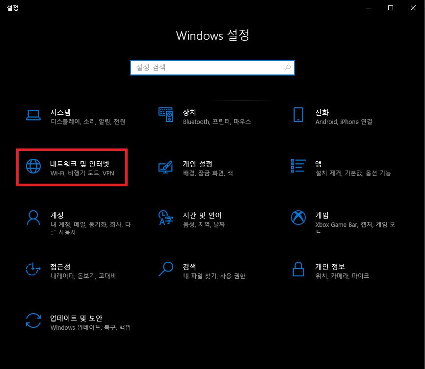 1. 단축키(WIN + i ) 윈도우 설정창을 띄운 후 네트워크 및 인터넷을 클릭합니다