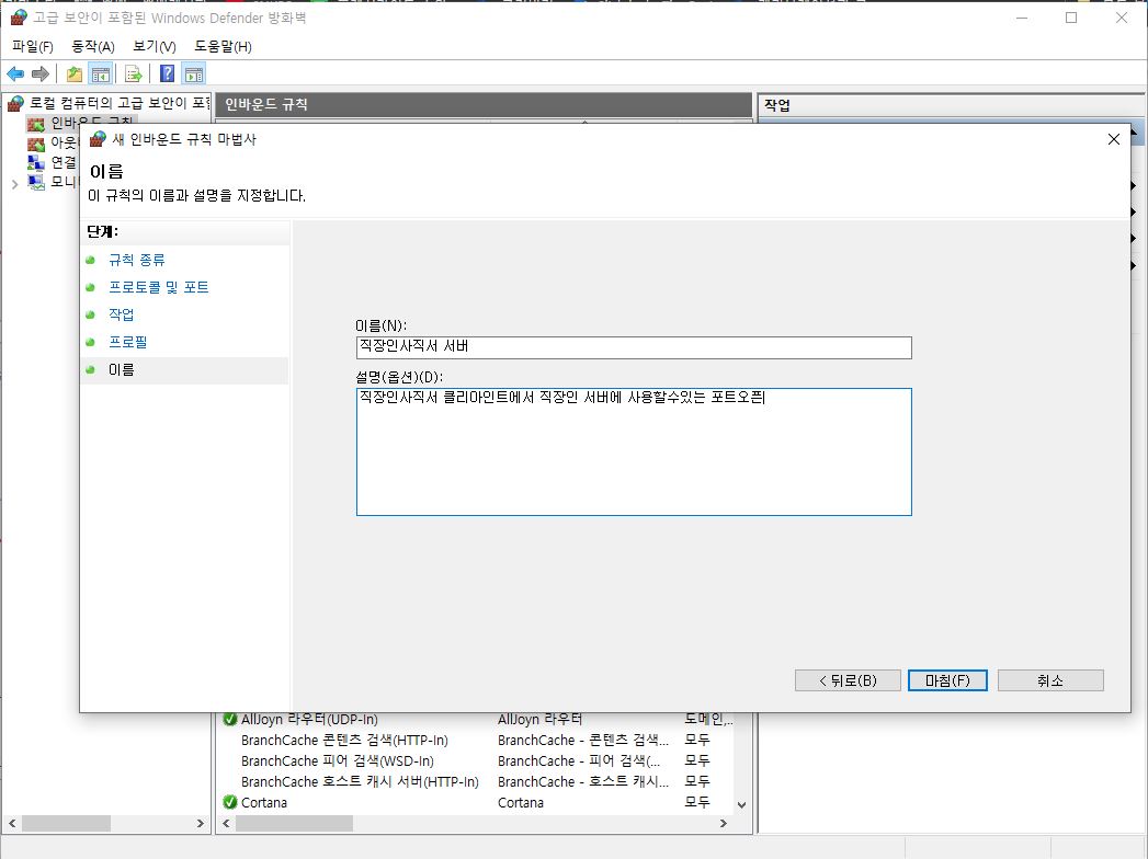 9. 규칙의 이름과 설명을 입력후 "마침(N)을 입력합니다