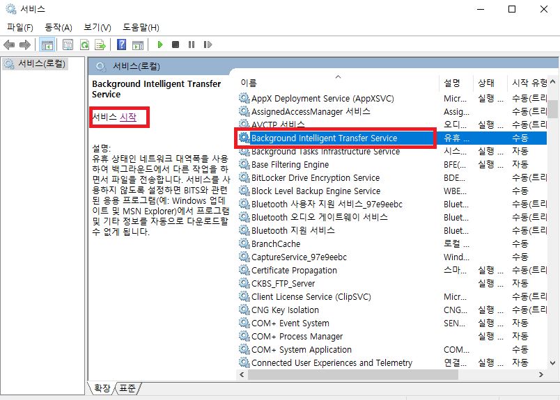 클릭후 Background Intelligent Transfer Service 이름을 찾아 "클릭" 왼쪽 "시작"을 클릭합니다