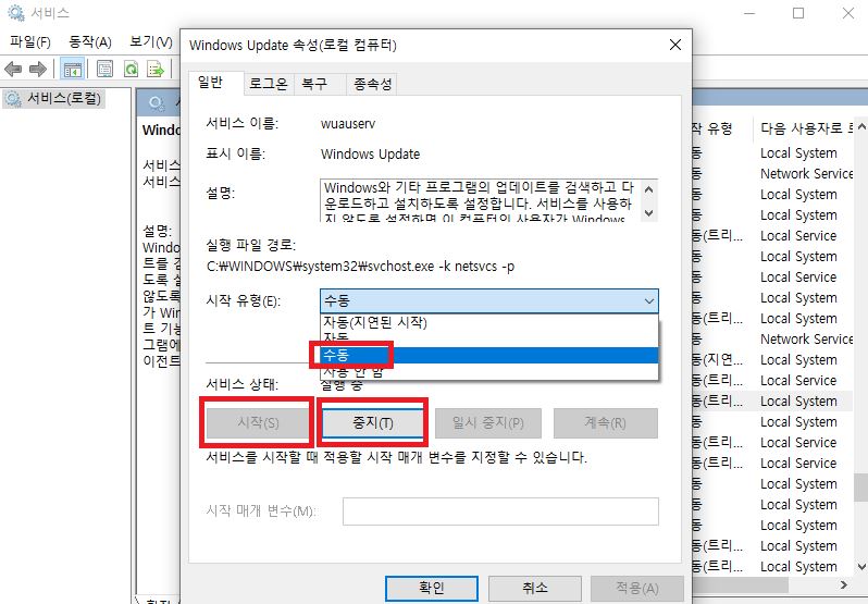 3) windows update 속성(로컬 컴퓨터) 창에서 시작유형(E) 클릭하여 수동으로 변경 후