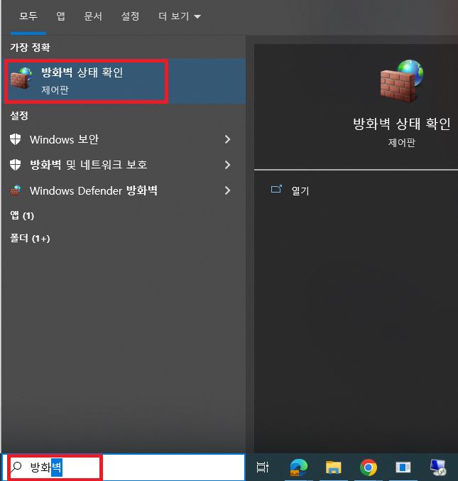 1) 하단 작업표시줄 앞쪽 검색창에 "방화벽 상태 확인" 검색 후 상당에 표시된 " 방화벽 상태 확인"을 클릭합니다