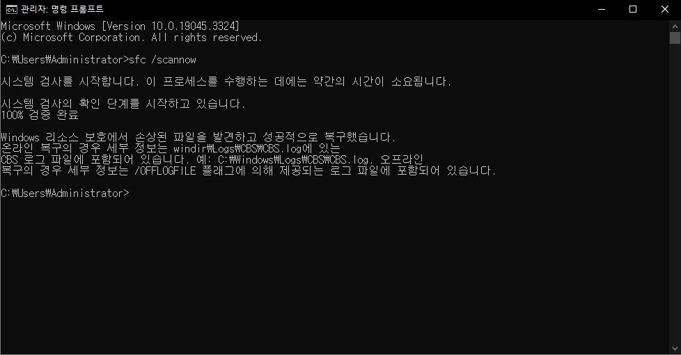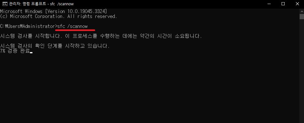 2) 관리자:명령프롬프트에서 sfc /scannow를 입력합니다
