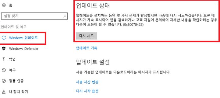 시간설정이 다르다면 윈도우 업데이트가 진행이 안될 수 있습니다