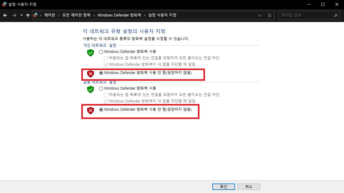 3) 설정 사용자 지정 창에서 개인 네트워크 설정 과 공용 네트워크 설정을 모두 windows Defender 방화벽 사용 안 함