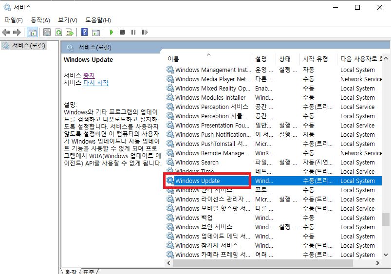 2) 서비스창에 "windows update" 우클릭 후 설정을 클릭합니다