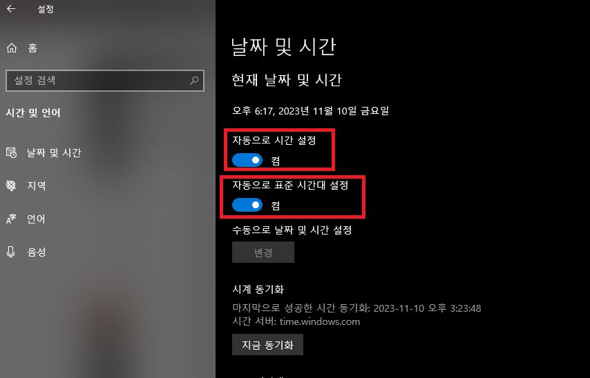 2) 날짜 및 시간에서 "자동으로 시간 설정" , "자동으로 표준 시간대 설정"을 켬으로 변경합니다