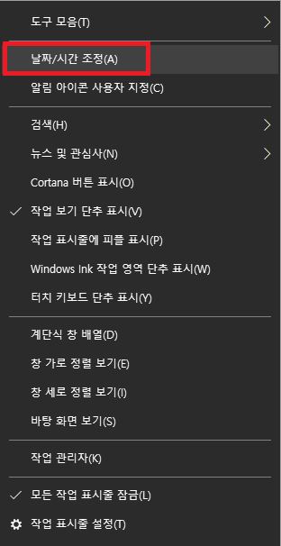 1) 작업표시줄에서 오른쪽하단 시간에 우클릭 시 표시되는 " 날짜/시간 조정(A)을 클릭합니다