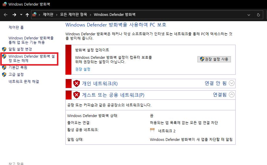 2) windows Defender 방화벽 창에서 "windows Defender 방화벽 설정 또는 해제" 를 클릭합니다